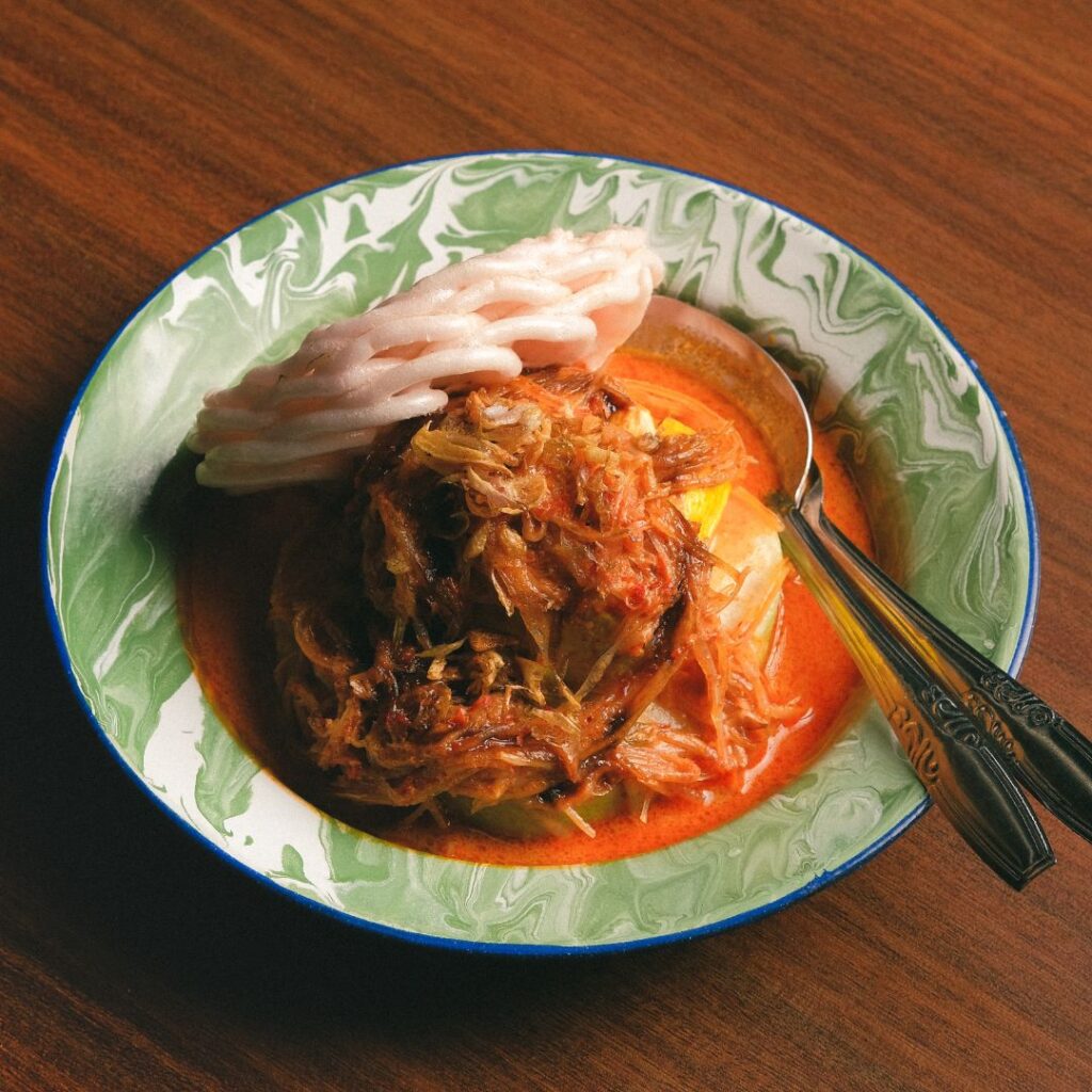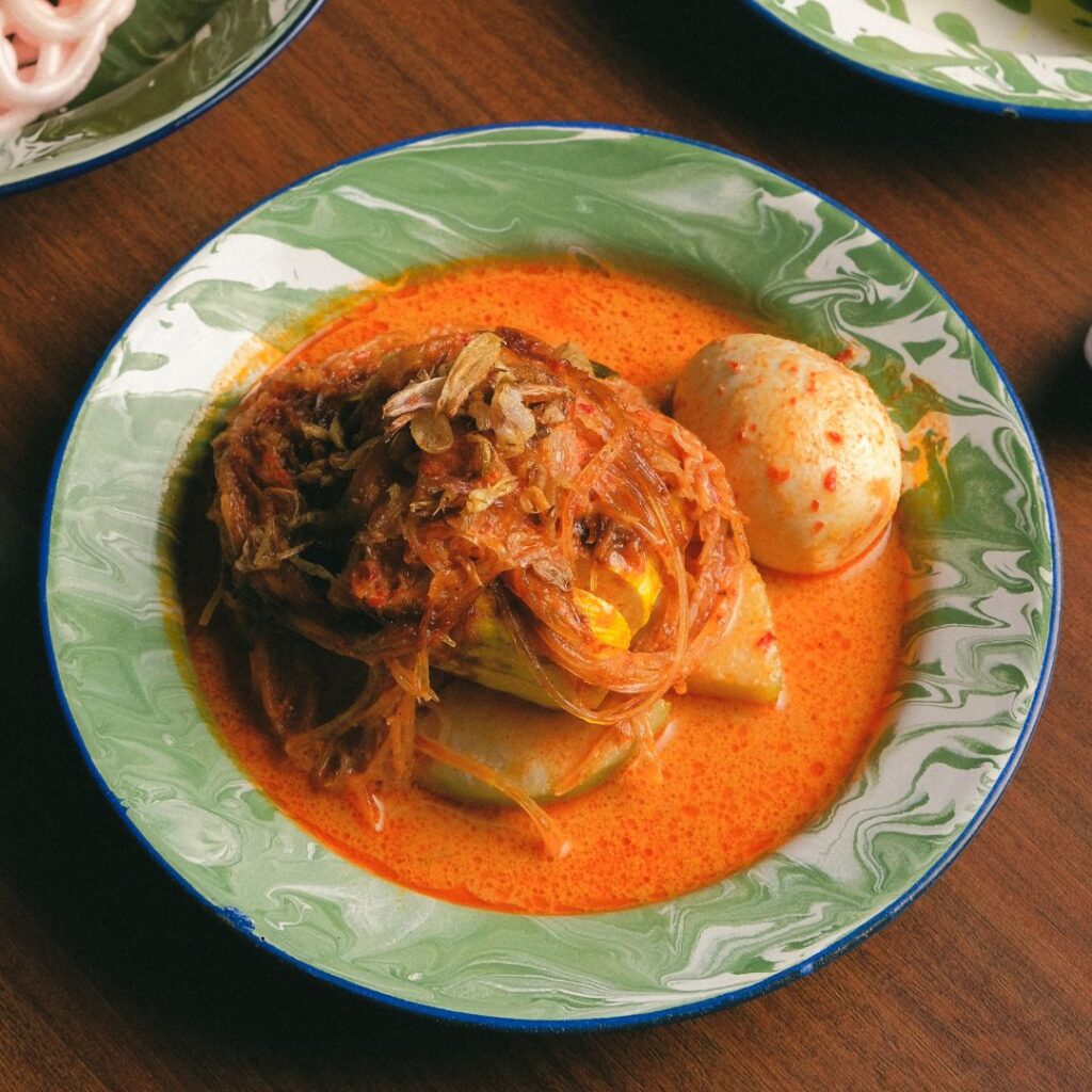 Lontong dipadukan dengan kuah santan dan tahu